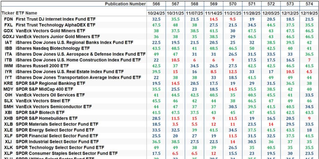 The Weekly Average Technical Ranking (“ATR”) is the average Technical Ranking of the 30 US Index and Sector ETFs we track. Like the TER, it is a confirmation/divergence as well as an overbought/oversold indicator.